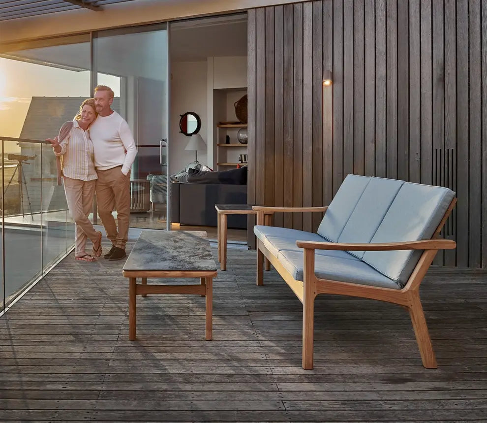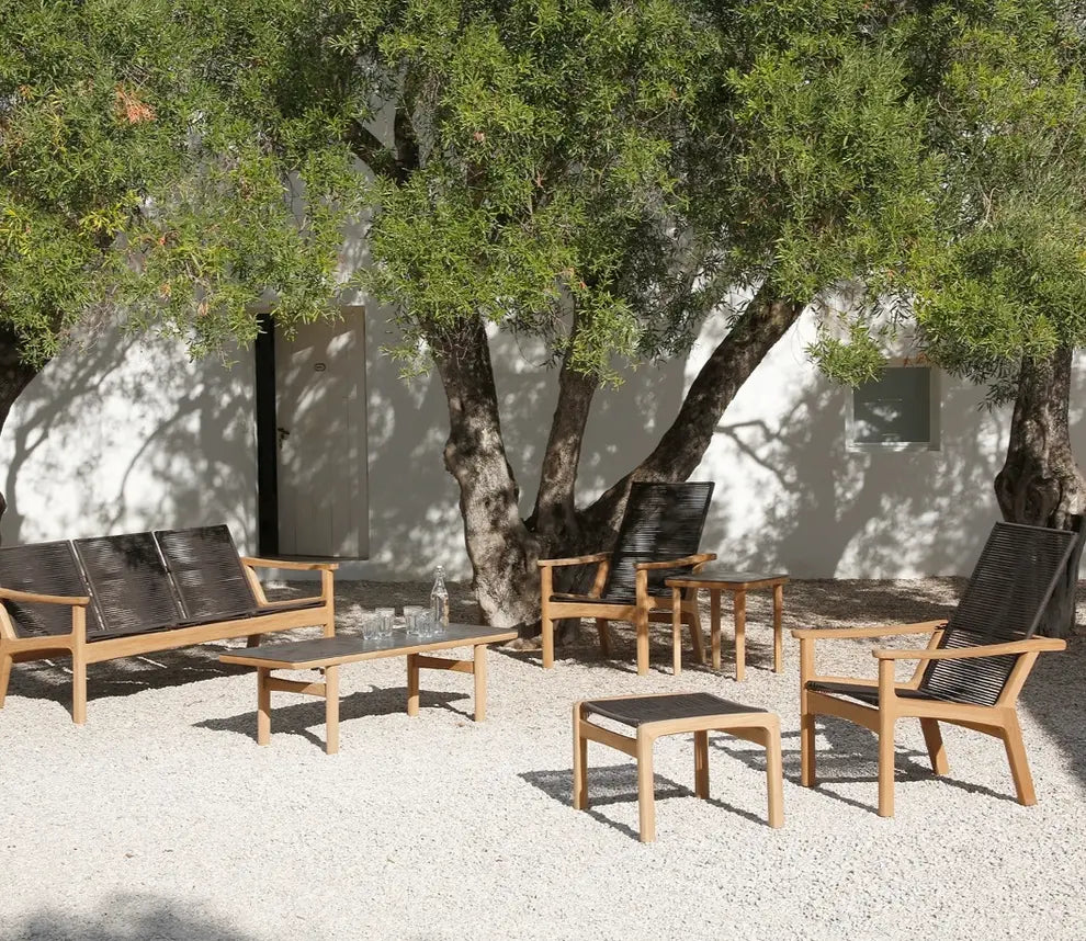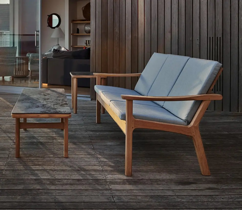150×50×45 cm rectangular low table with 23 kg teak base + Italian ceramic top – perfect Deep Seating coffee table height.