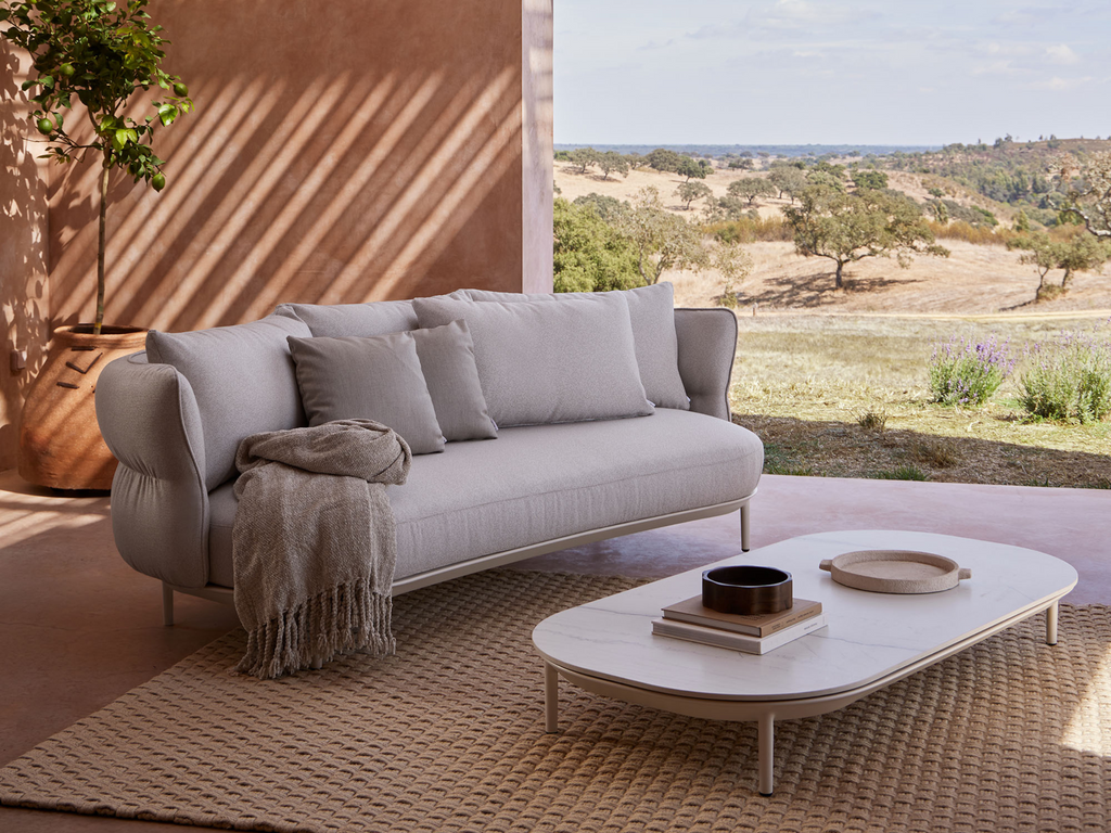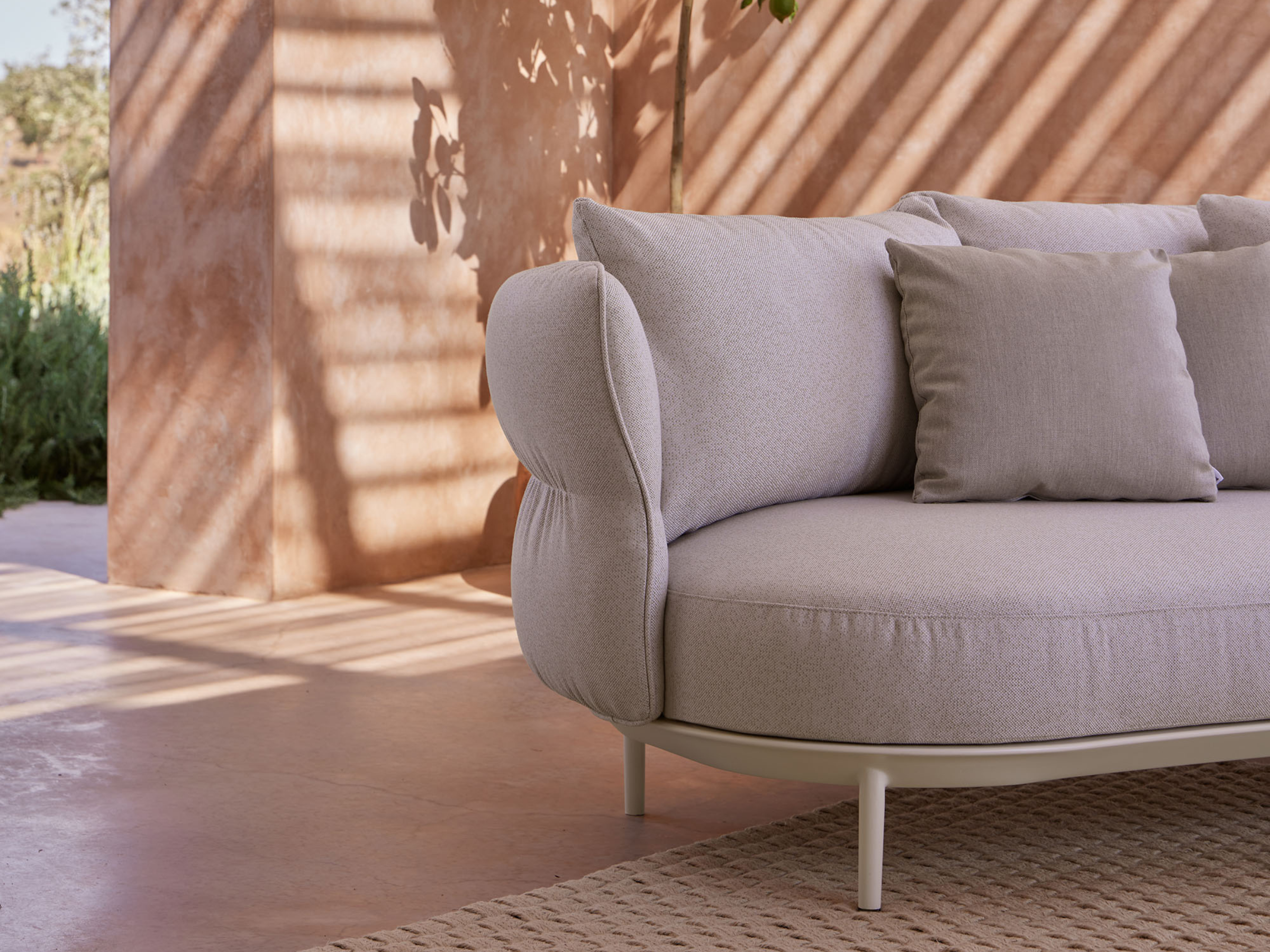 The POINT Amba Fabric Sofa brings refined comfort and modular adaptability to modern outdoor spaces. Crafted with a resilient powder-coated aluminum structure and upholstered in premium 100% solution-dyed acrylic fabric, this sofa offers long-lasting performance with a clean, contemporary silhouette. Its generous proportions and supportive cushions provide exceptional comfort for lounging in style.
