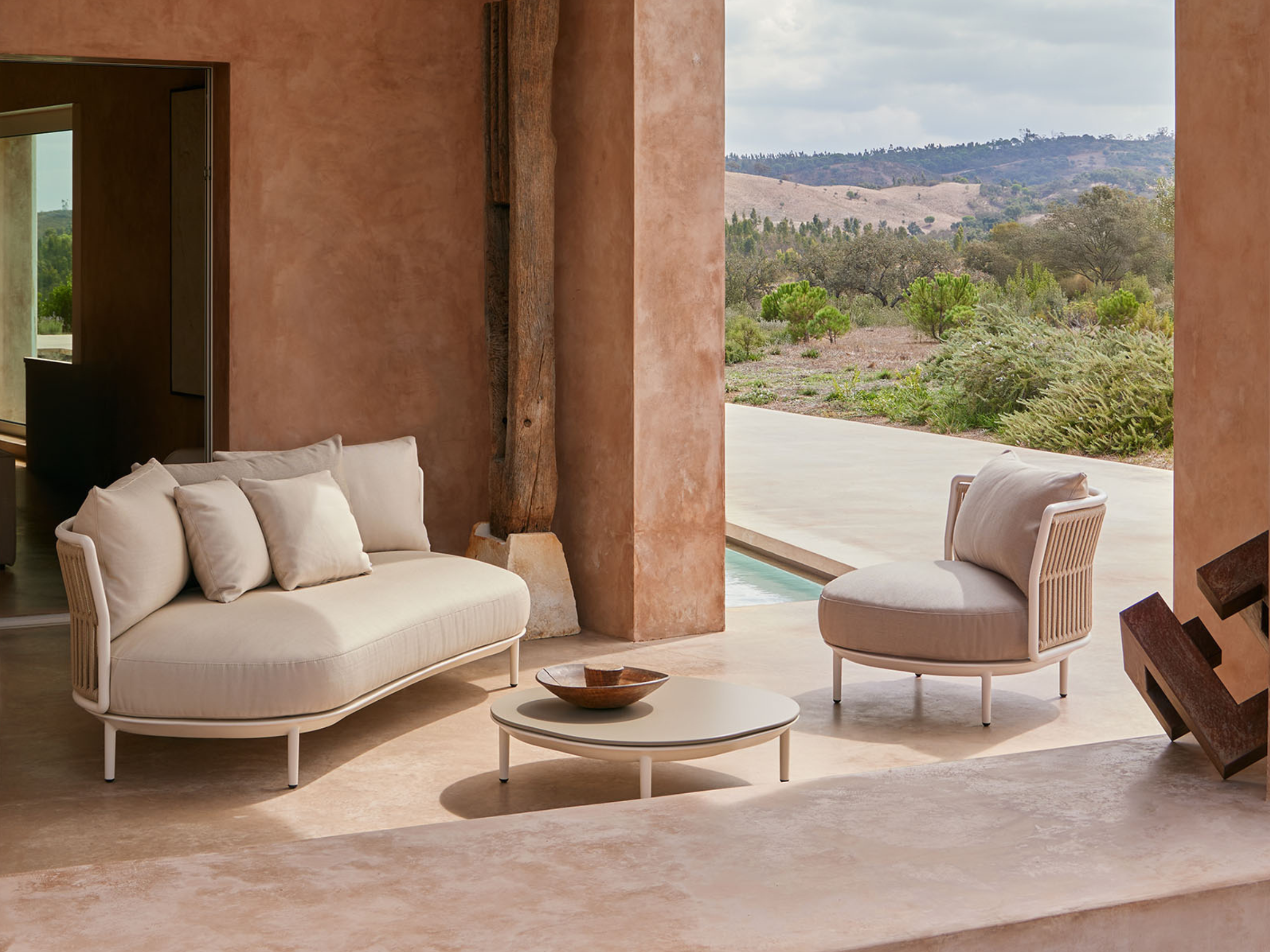 The POINT Amba Rope Corner Lounge Chair is the perfect modular component to create versatile outdoor lounge configurations. Built with a robust powder-coated aluminium frame, it is artfully wrapped in 10 mm rope for both visual texture and structural comfort. Featuring luxurious cushions upholstered in 100% solution-dyed acrylic fabric, this piece is made to endure the elements in style. Available in two sophisticated finishes—78 Mineral White with Sandstone String and 80 Gunmetal Grey with Graphite String.