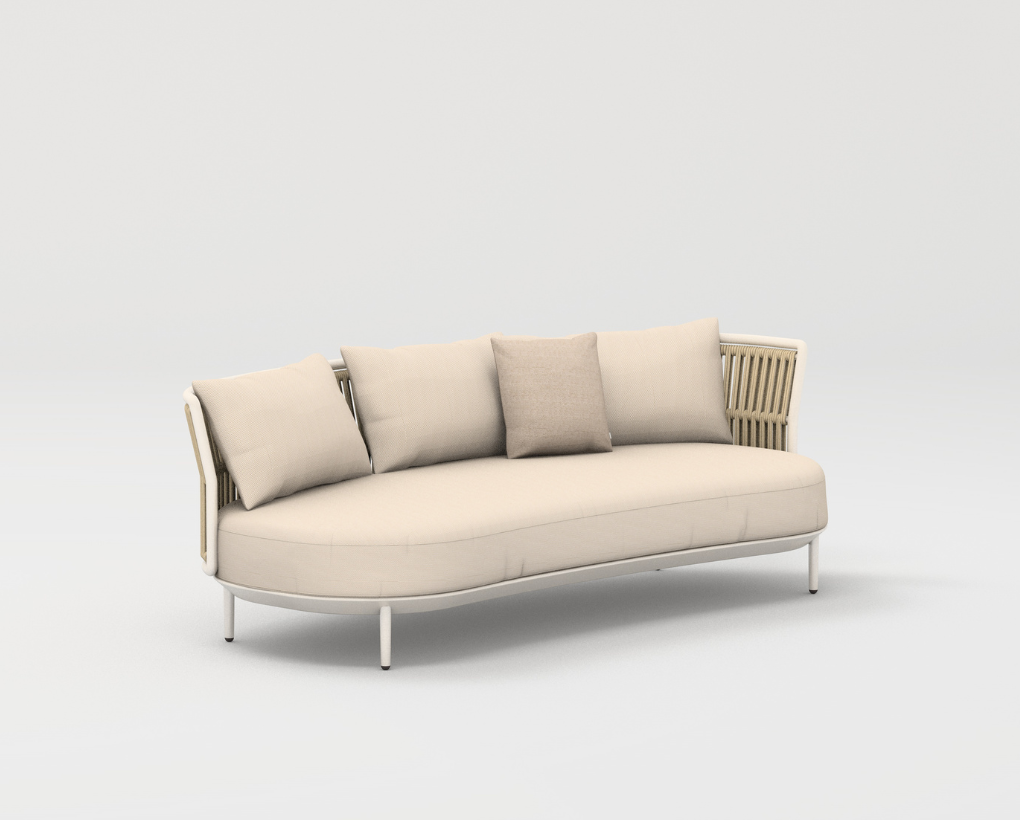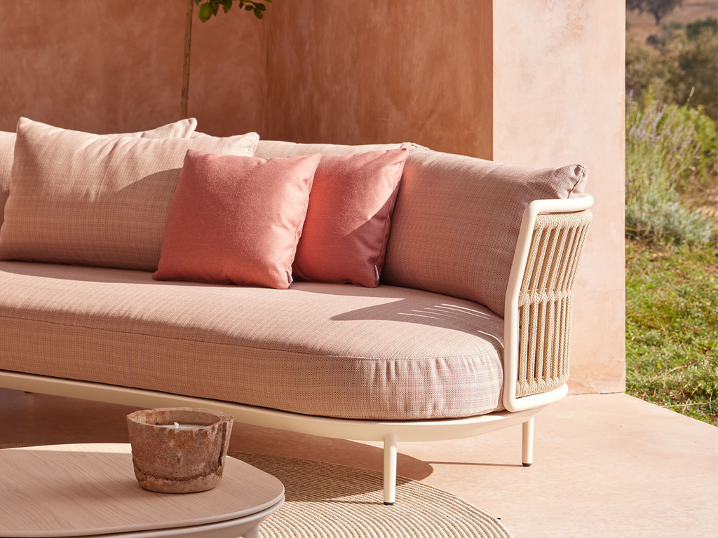 The POINT Amba Rope Sofa brings together luxurious comfort and contemporary design. Crafted with a robust powder-coated aluminium structure and hand-woven with 10 mm rope, this elegant outdoor sofa is built to endure while offering refined visual texture. Cushions are made with 100% solution-dyed acrylic fabric, ensuring high resistance to the elements. Choose between two sophisticated colorways—78 Mineral White with Sandstone String or 80 Gunmetal Grey with Graphite String—for a tailored outdoor aesthetic.