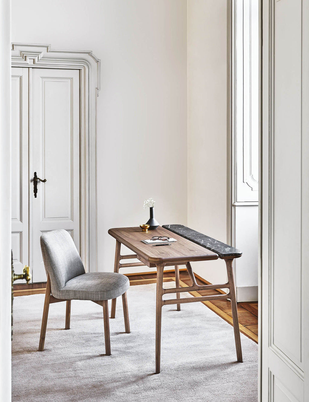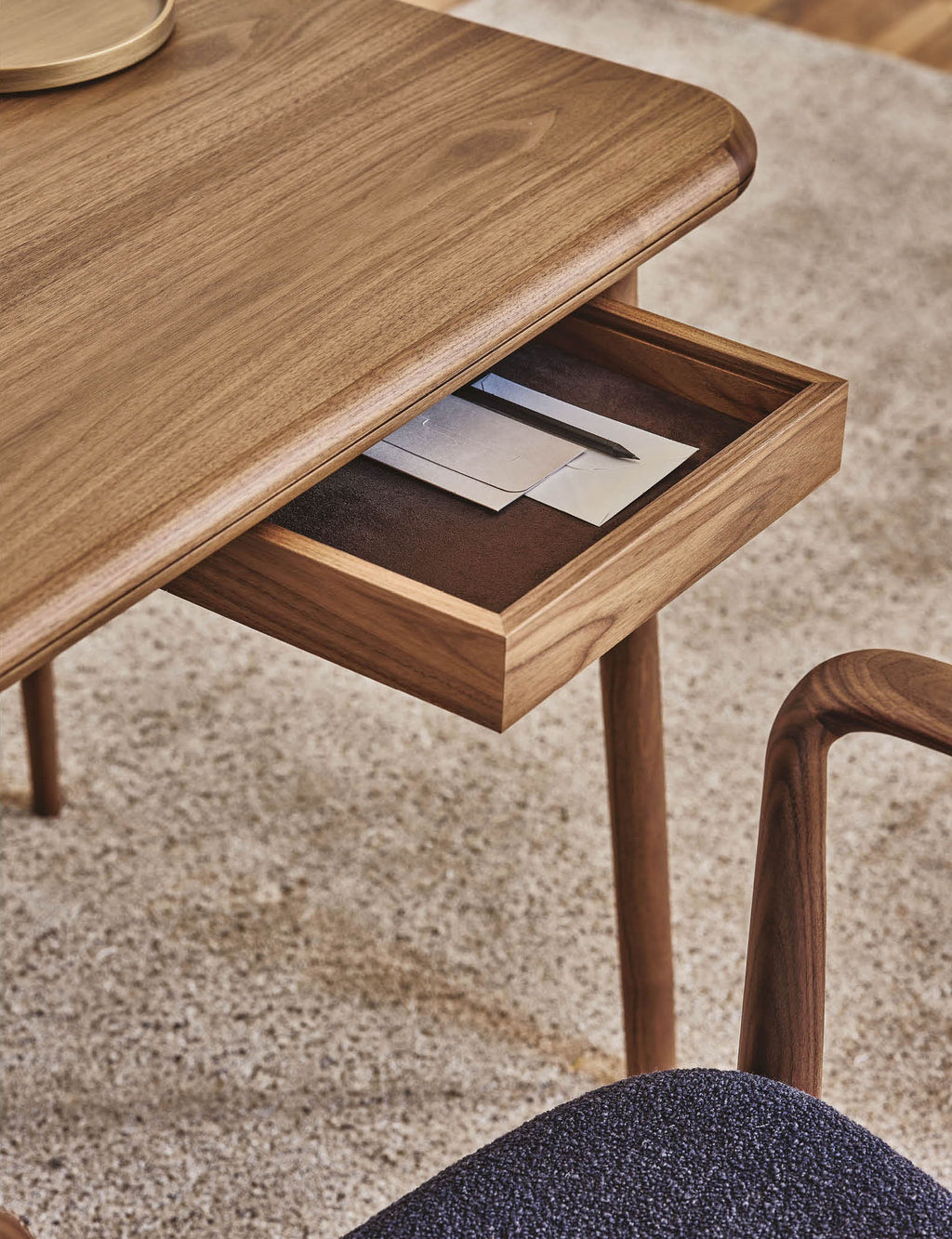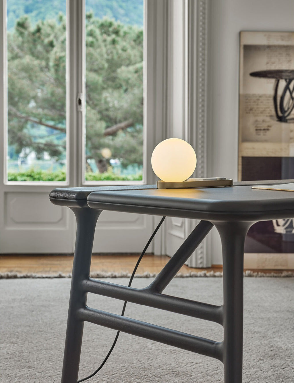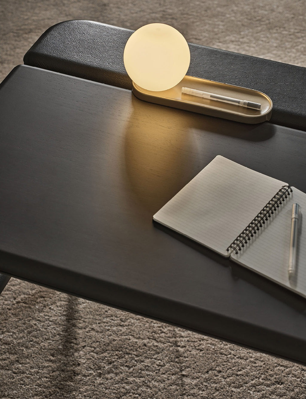 A single drawer, to be specified left or right, enhances daily workflow. For holistic workspace solutions, the Aksel Lamp can be added—a table lamp designed by the same studio, featuring a white opal etched glass diffuser and a Champagne-finish Baydur base that matches the pencil tray and organiser. This harmonious blend of woods, marbles, leather, and metals makes Aksel suitable for creative offices, sophisticated homes, and contract spaces.