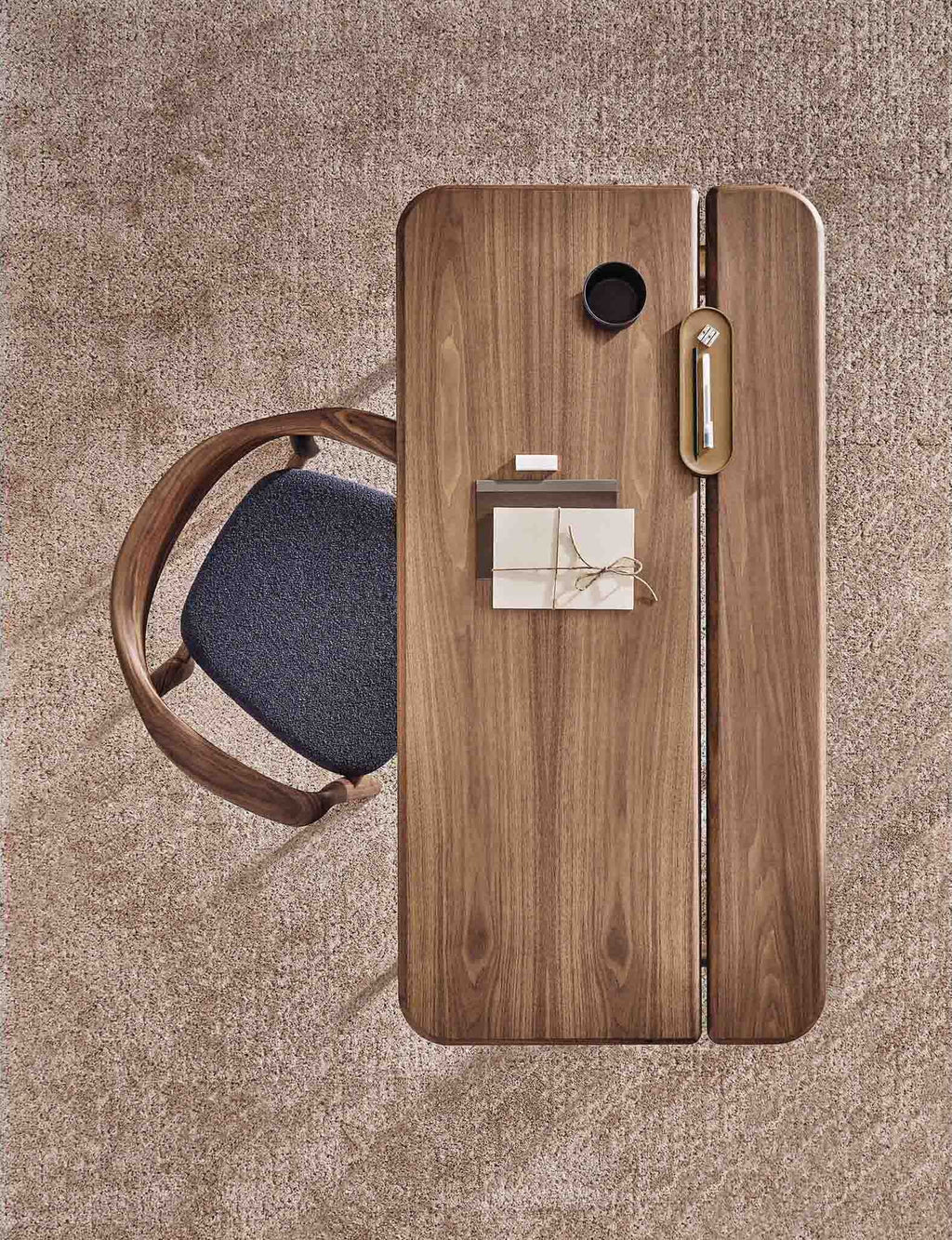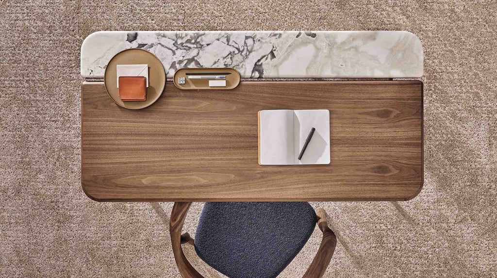 The Aksel desk by Meneghello Paolelli is a contemporary composition where essential lines meet technical precision and stylistic versatility. Aksel’s main top is always in canaletta walnut, while the raised back section may be crafted in canaletta walnut, select marbles, or Plus leather in the collection’s shades—accentuating the desk’s visual depth and tactile variety. A defining groove splits the top into two sections, acting as both a graceful design element and a functional channel: cables for electronic devices can pass through, while Porada’s optional Champagne-finish oval pencil tray and round organiser accessories fit snugly for everyday convenience and elegance.