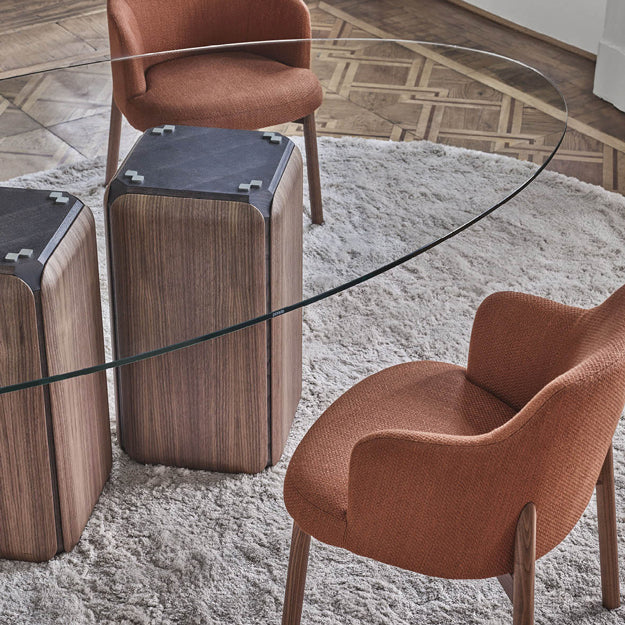 - Premium Tempered Glass Top: Features premium tempered glass top (12mm thickness) available in transparent clear or sophisticated smoked finishes that appear to float gracefully above the dual monolithic walnut bases, creating visual lightness while providing generous dining surface and allowing full appreciation of the distinctive sculptural base design.