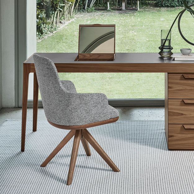 The Porada Connie Swivel Dining Chair designed by Cristina Ballabio represents the perfect evolution of contemporary dining elegance, combining the sophisticated aesthetics of the classic Connie collection with modern swivel functionality for enhanced versatility and workspace adaptability. This exceptional chair features a distinctive solid ash swivel base with refined grey pewter metal inserts, paired with luxurious upholstery that can be customized with matching or contrasting button and backrest details for personalized design expression. Available in both streamlined versions without armrests and comfortable configurations with integrated arms, the Connie Swivel demonstrates Ballabio's mastery of creating furniture that seamlessly adapts from formal dining environments to contemporary office spaces while maintaining the highest standards of Italian craftsmanship and ergonomic comfort.