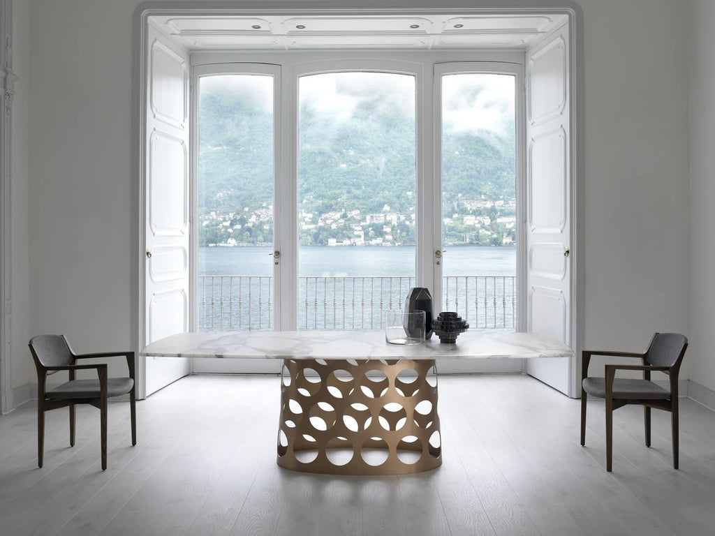 The Porada Jean Marble Dining Table, designed by Carlo Ballabio, exemplifies refined Italian craftsmanship in both its round and barrel-shaped forms. Each Jean table showcases a bold sculptural metal base offered in elegant matt black, bronzoro, or grey pewter, supporting a luxurious 20mm thick marble top with seamless precision. Available as either a classic round silhouette or an architectural barrel shape, the Jean is a centerpiece for contemporary and traditional interiors alike.