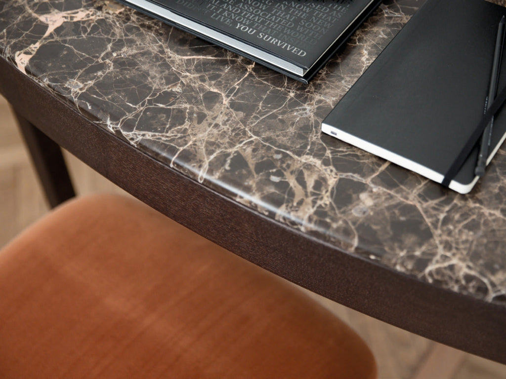 - Elegant marble top in a choice of Sahara Noir, Calacatta Oro, Emperador Dark, or Carnico