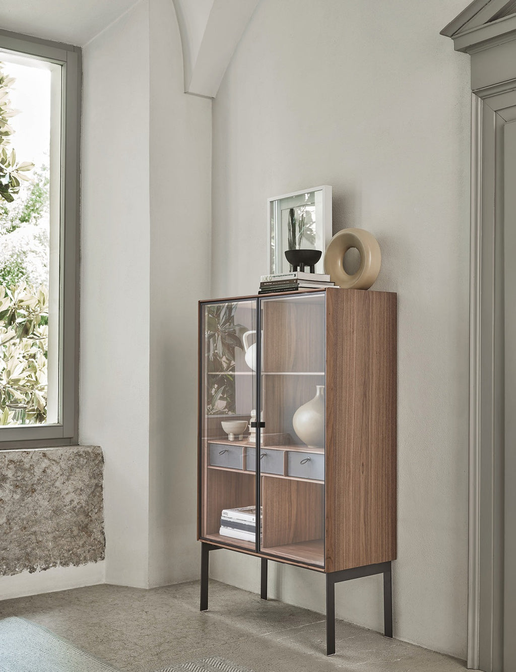 Tall cupboard in Canaletta walnut structure, suspended on a grey pewter metal base