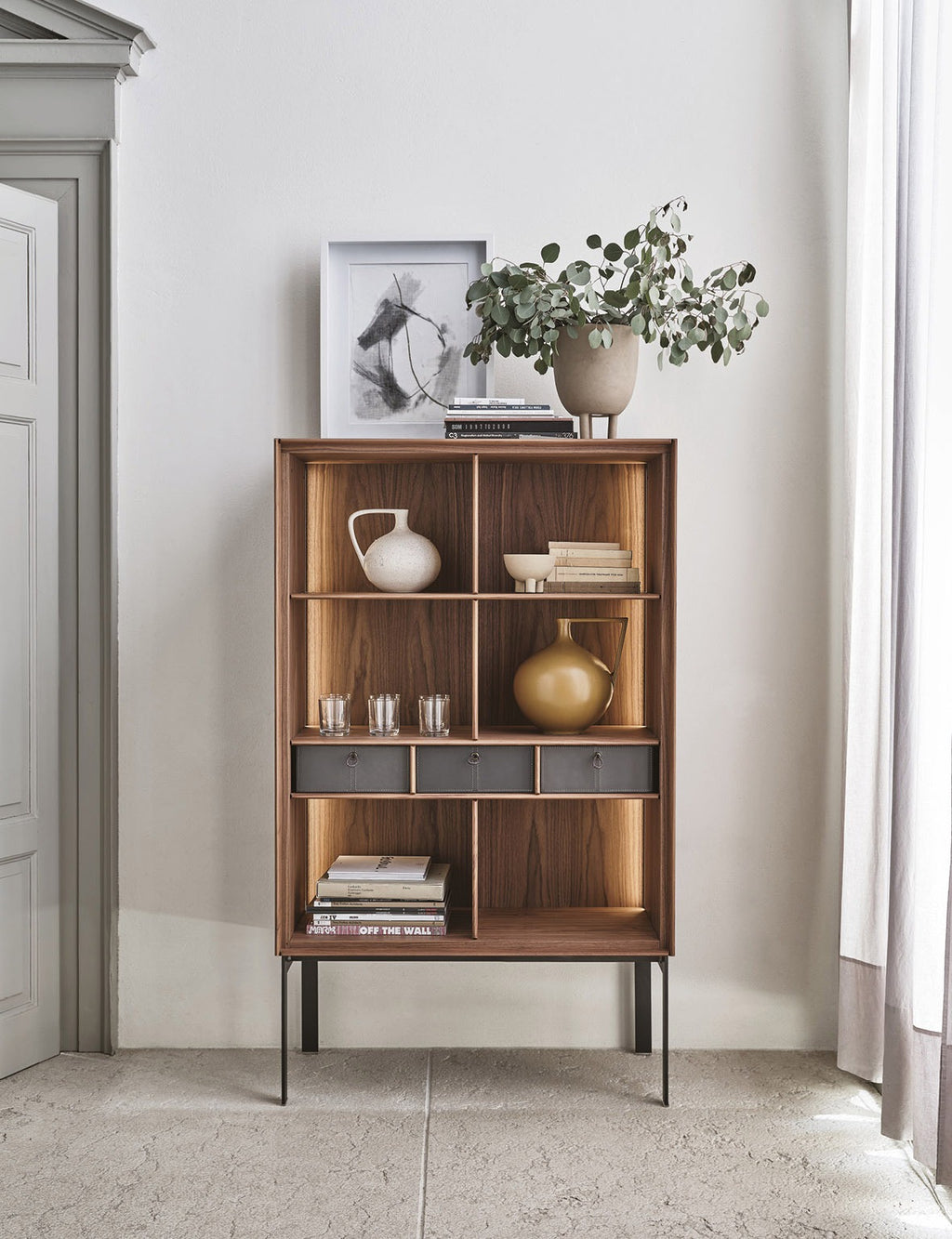 Open‑front tall cupboard with no glass doors. Back panel in Canaletta walnut, textured bronze metal, or Cuoio. LED‑lit interior with shelves and open compartment. Up to three drawers can be inserted.