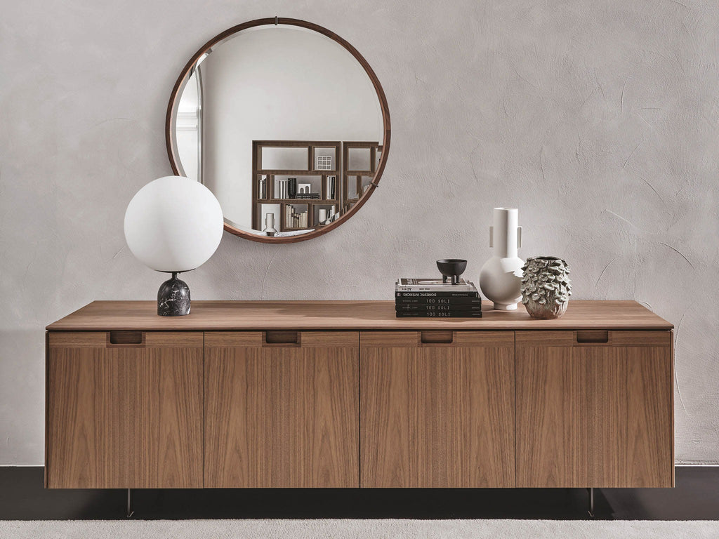 Matics 4 Sideboards, by G. & O. Buratti, are elegant, low credenzas in Canaletta walnut resting on a light pewter‑finished metal base. The collection comes in two distinct versions: Matics 4 legno, with four wooden doors featuring a horizontal–vertical grain inlay and recessed handle, and Matics 4 cristallo, with four Stopsol super silver clear glass doors on a pewter‑metal frame and an LED‑lit interior. Both models can be finished with a wooden or marble top, allowing the sideboards to adapt easily to refined living and dining spaces.