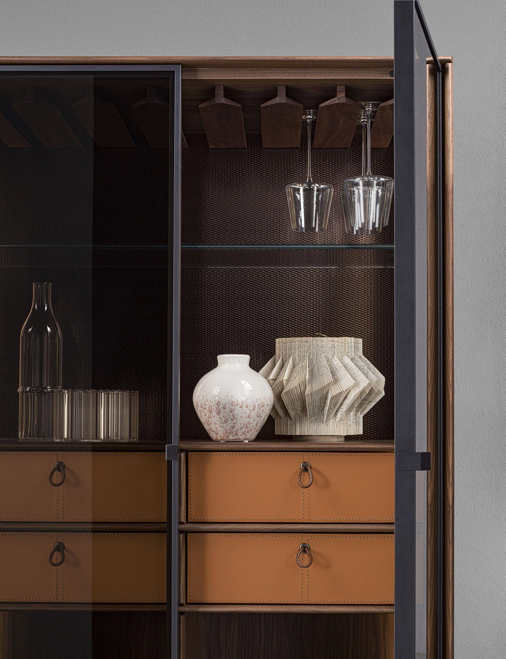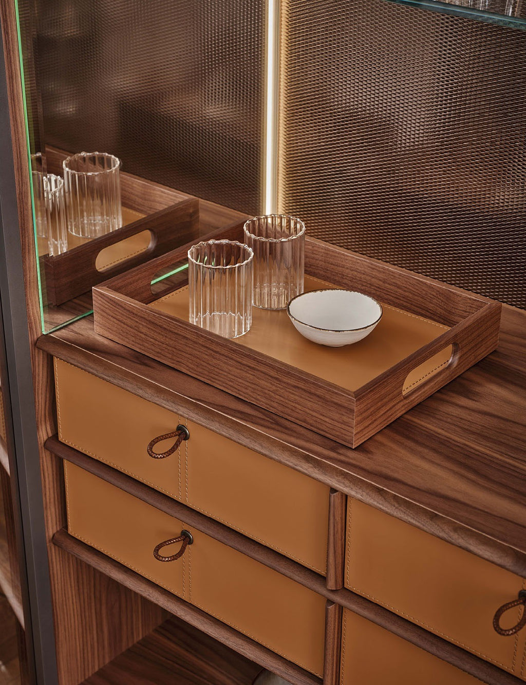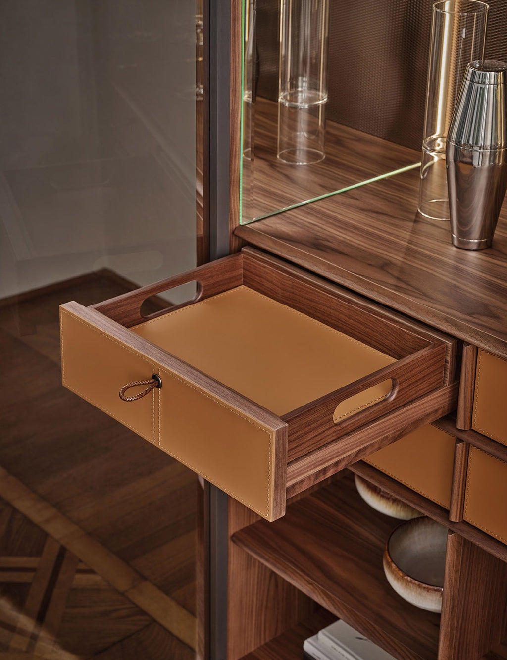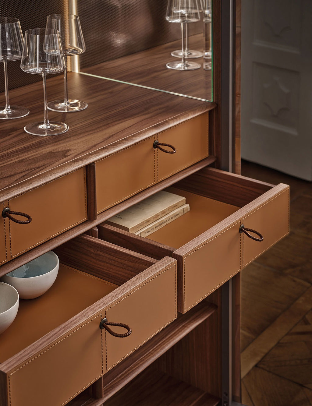 - Four drawers with Cuoio leather fronts and bases, featuring scoubidou braided leather handles