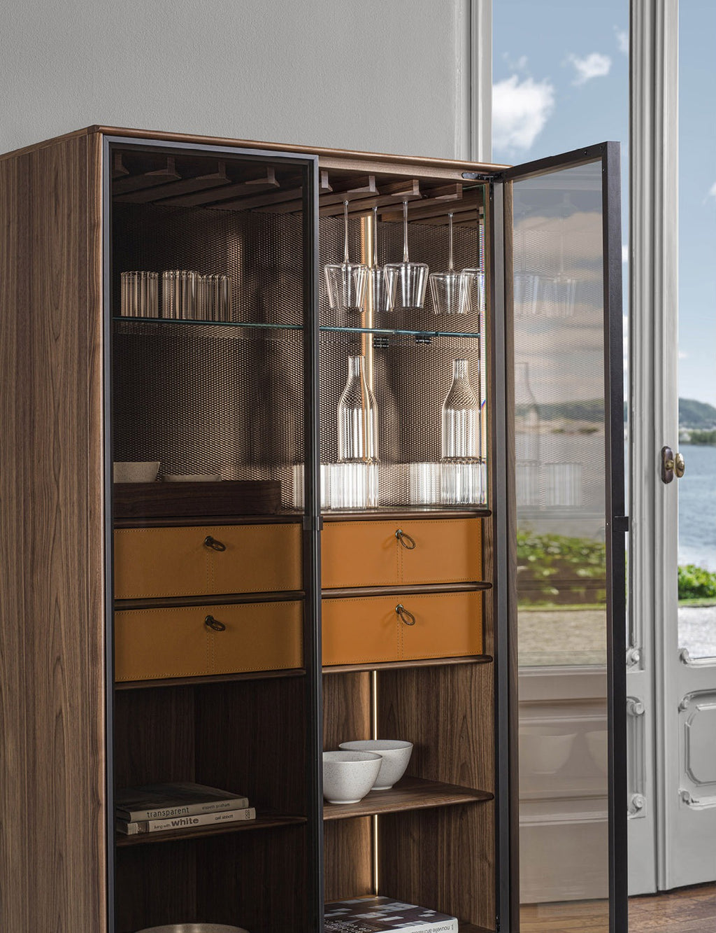 - Bar cabinet in Canaletta walnut with two Stopsol super silver clear glass doors