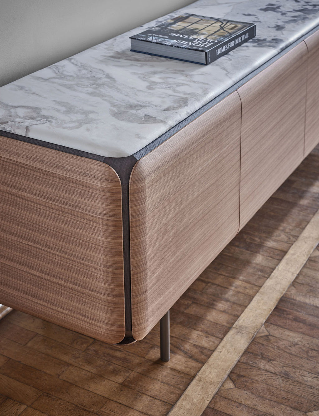Pebble Sideboard, designed by Niccolò Devetag—winner of the 2019 Porada Design Award—embodies a minimalist approach that still celebrates Porada’s passion for wood and craftsmanship. A continuous Canaletta walnut frame traces the entire profile of the sideboard, with softly rounded solid‑wood corners that give it an organic, pebble‑like silhouette. Behind the four hinged doors, a refined interior in grey‑stained ash wood is paired with smoked glass shelves, creating a subtle contrast of tones and materials above a slender pewter‑grey metal base.