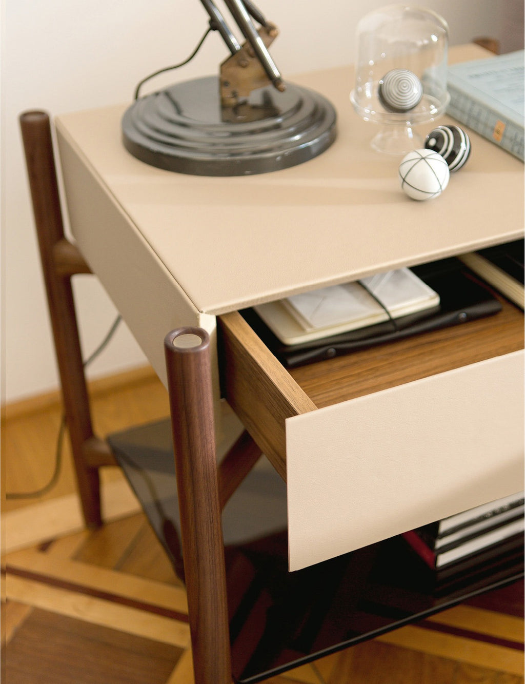 - Luxurious leather-covered drawer brings sophisticated elegance to bedside storage.