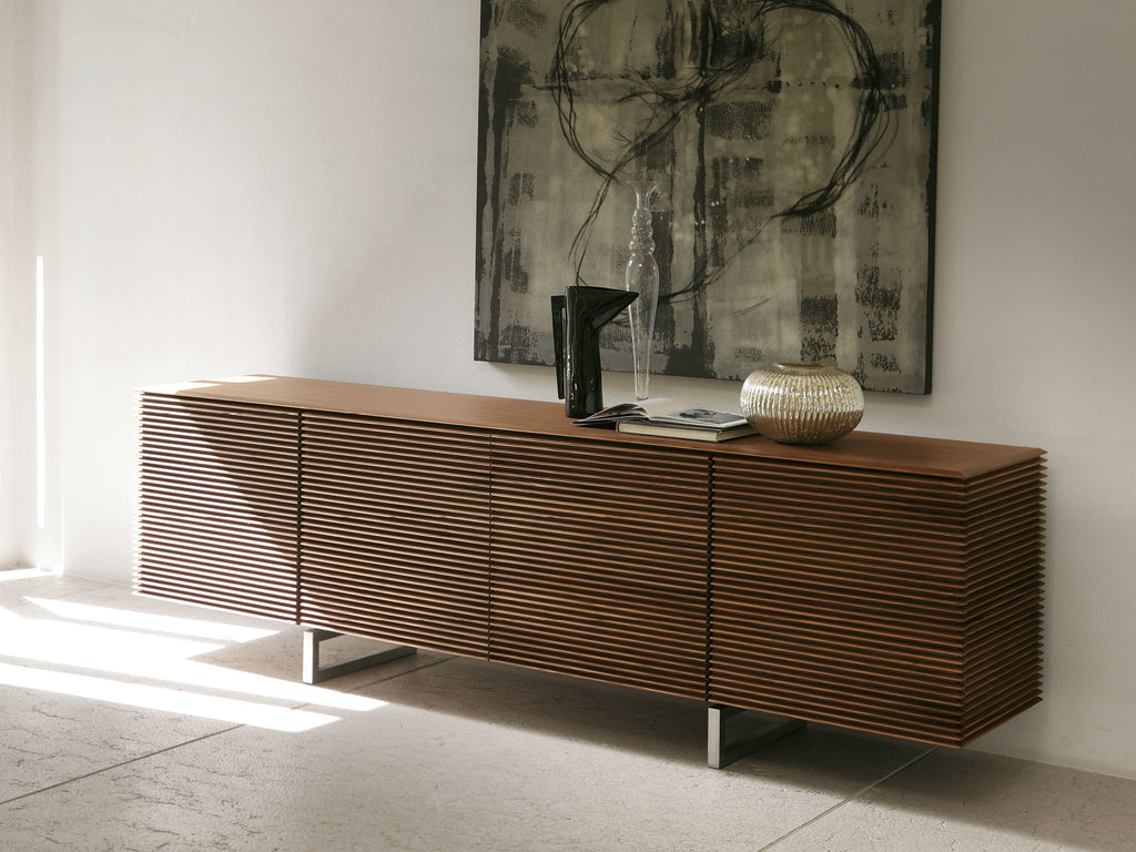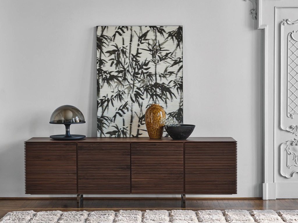 Riga Credenza, designed by T. Colzani, is an elegant sideboard combining functional practicality with a refined aesthetic. Its signature feature is a regular, cadenced geometric motif running the full height of the front—a visual rhythm from which the collection takes its name. Available in 3‑door and 4‑door configurations, Riga features push‑pull opening on central doors and traditional hinged opening on the sides. The structure is entirely Canaletta walnut, while the slender metal base is offered in satin chrome or Kajal finish, adding a contemporary accent. Crystal shelves inside lend an airy sense of lightness to this beautifully balanced storage piece.
