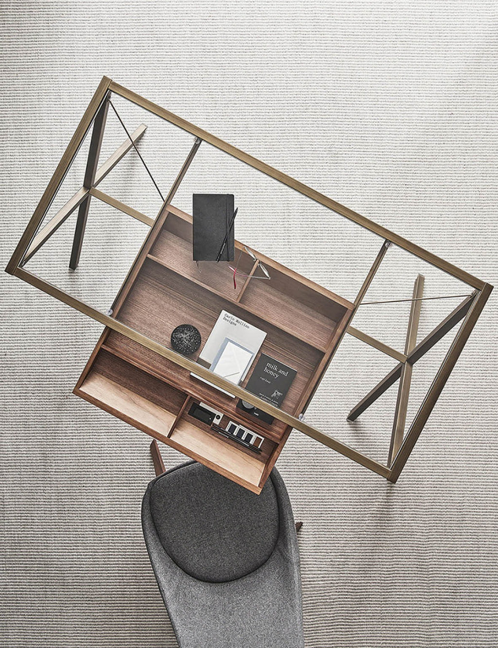 The Stylo 140 writing desk by Tarcisio Colzani for Porada embodies refined linearity and high-quality material harmony. Its slim, geometric frame in brushed bronzed brass supports a top available in either solid Canaletta walnut—showcasing warm wood grain and a practical central drawer—or a transparent tempered glass surface for a lighter, more contemporary effect.