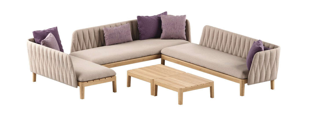 The Royal Botania Calypso Lounge Set 06 is a masterclass in modular outdoor luxury, designed to deliver maximum seating and aesthetic cohesion for expansive terraces or contemporary garden lounges. This L-shaped composition features two generous sofas, two daybeds, and a sleek coffee table—all built on the brand’s iconic solid teak frame and finished with plush, weatherproof cushions.