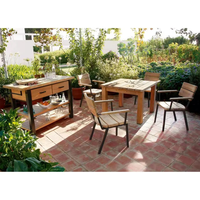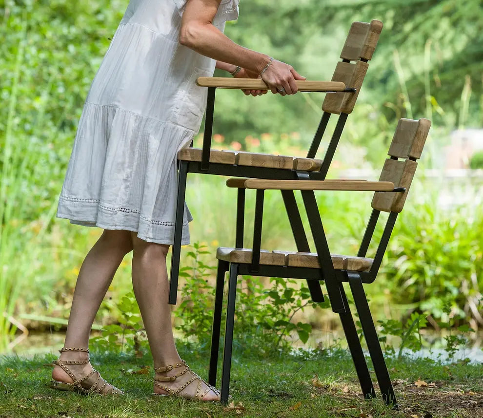 Introducing the Barlow Tyrie Titan Armchair, a rugged 61 × 63 × 86 cm farmhouse-style dining chair featuring rustic laminated teak seat/back with black powder-coated aluminum frame – stackable, comfortable, and built for outdoor durability (9 kg).