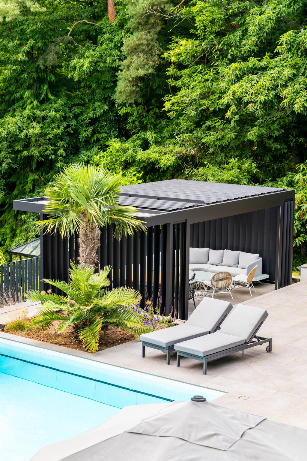 This unique property with a vast outdoor space spanning several levels, features a tennis court, pool, hot tub, outdoor kitchen and greenhouse. The Client’s needed a shade solution as well as protection from the large mature trees, and wind being at such a high aspect. The size of the pergola was large enough for an 8-seater dining table and a large L-shaped sofa and two armchairs.